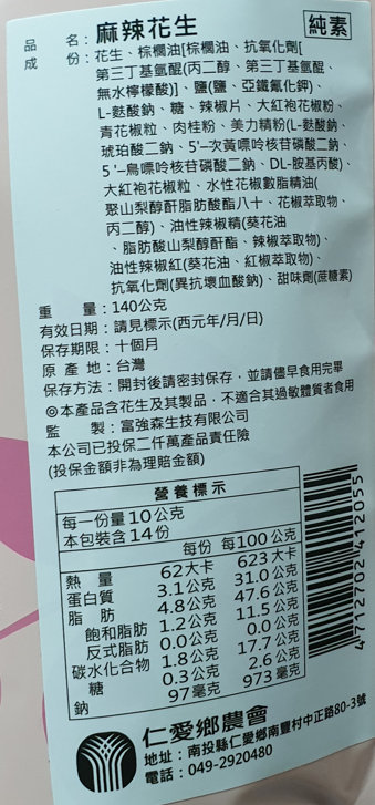 成分:花生、棕櫚油[棕櫚油、抗氧化劑[第三丁基氫醌(丙二醇、第三丁基氫醌、無水檸檬酸)]、鹽(鹽、亞鐵氰化鉀)、L-麩酸鈉、糖、辣椒片、大紅袍花椒粉、青花椒粒、肉桂粉、美力精粉(L-麩酸鈉、琥珀酸二鈉、5’-次黃嘌呤核苷磷酸二鈉、5’-鳥嘌呤核苷磷酸二鈉、DL-胺基丙酸)、大紅袍花椒粒、水性花椒樹脂精油(聚山梨純酐脂肪酸酯八十、花椒萃取物、丙二醇)、油性辣椒精(葵花油、脂肪酸山梨醇酐酯、辣椒萃取物)、油性辣椒紅(葵花油、紅椒萃取物)、抗氧化劑(異抗壞血酸鈉)、甜味劑(蔗糖素)